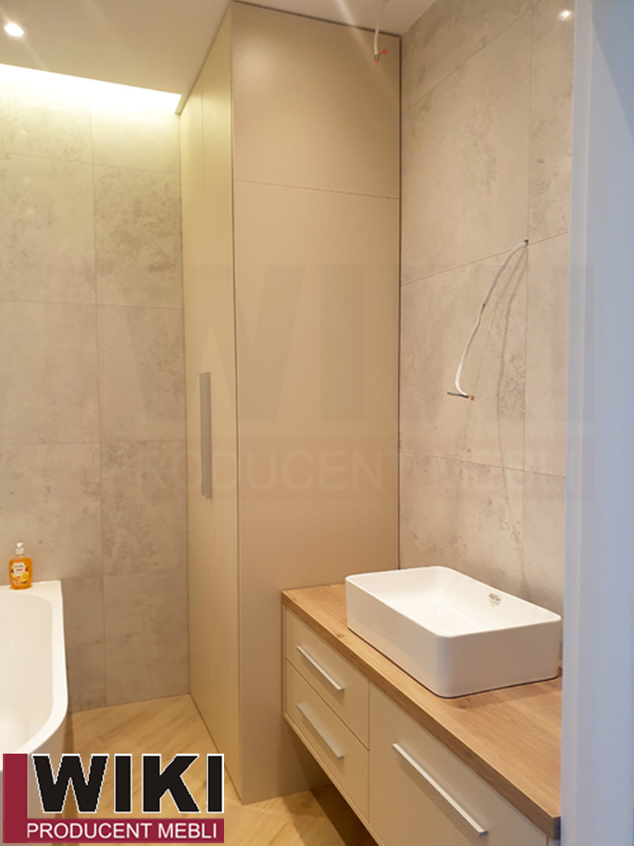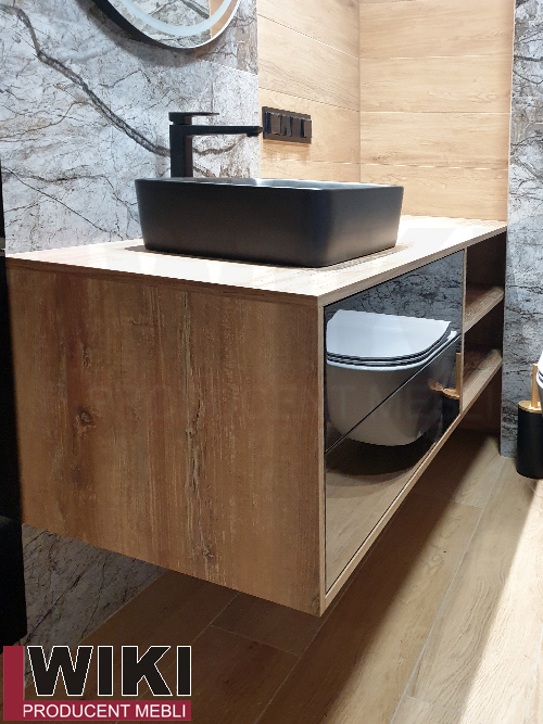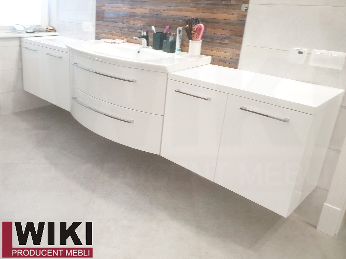 Szafka łazienkowa wisząca, tym razem z zlewem wpuszczanym. Konstrukcja została tak zaprojektowana aby wypełnić przestrzeń wokół. Jeżeli wykonali byśmy szafkę idealnie pod zlew, powstały by po bokach puste przestrzenie. W małych łazienkach często zależy nam na wykorzystaniu jak największej dostępnej przestrzeni. Pozostawienie pustej przestrzeni pod pozwala nam na utrzymanie porządku. Dodatkową zaletą podwieszanych mebli jest uniknięcie długotrwałego zamoczenia mebli podczas awarii np. pralki.