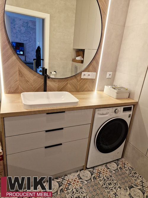 Nie zawsze mamy w małych mieszkaniach miejsce, gdzie można postawić pralkę. Najczęściej loduje ona w kuchni lub musimy ją zmieścić w łazience. W tej łazience zależało nam na przedłużeniu blatu szafki zlewowej. Takie rozwiązanie prowadzi do zastosowanie zlewu wpuszczonego – nie nakładanego. Nie mówię że się tego nie robi, jednak wysokość w tym przypadku misy zlewowej była by na wysokości 100 cm a to znacząc za wysoko! Wstawienie zlewu częściowo wpuszczanego to świetne rozwiązanie.