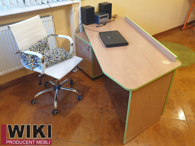 Czasy się zmieniają i powstało biurko ze schowkami LWiki. Dość nie typowa konstrukcja nie tylko bryły ale i blatu. Blat musiał być z prawej strony wycięty. Wynikało to z umieszczenia w tym miejscu przeszkody, w postaci betonowego słupa. Blat został podzielony na dwie części stałą i podnoszoną. Na stałej postawiona została nadstawka. W ofercie występują dwa rodzaje zwykła i z oświetleniem. W część ruchoma jest na całej długości podnoszona.
